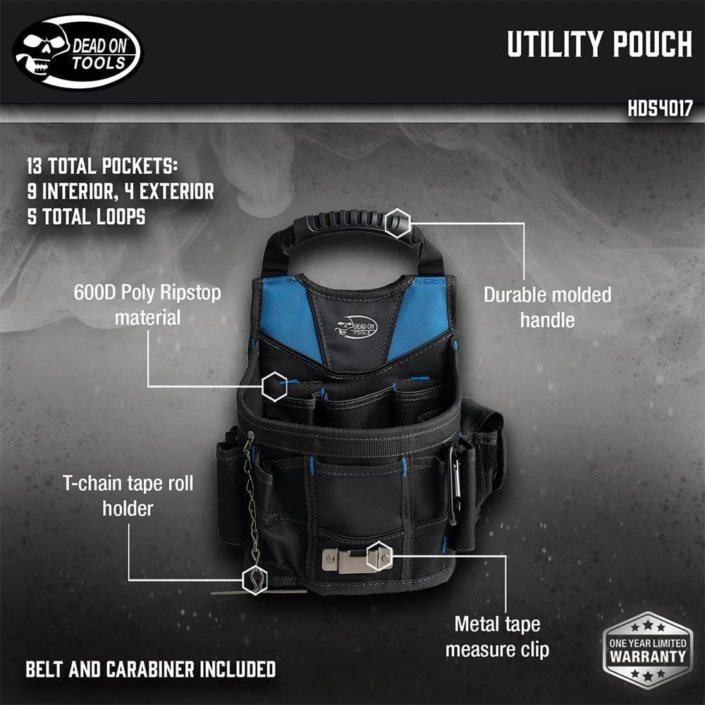 Dead On has risen again! We, the Dead On Tools team, have upgraded our tool rigs and pouches. The iconic DO21C framing hammer is as good as ever. The Annihilator wrecking bar – well, just look at it and you know it means business. The Exhumer nail puller, still the champ. Dead On tool-users don’t check their personality when they punch the clock. Our products match that lifestyle, and stand out in a category of commodity products. The Dead On brand and skull logo are about to become icons for those end users.The Dead On Tools 10 in. Open Top Tool Tote Utility Pouch Bag with Black Finish and 12 total pockets is great for holding various small and medium size hand tools. This utility pouch is constructed with an industry-leading 2-ply 1680 Denier Poly Ripstop Ballistic nylon fabric for durability. The large main pouch allows the user to easily view and access their tools. There are five exterior tool loops for holding screwdrivers or other similar tools. The HD54017 features 3-Back-wall Tool Slots, T-Chain Tape Roll metal tape measure clip, metal carabiner, and 12 pockets – great for electrician tools. Carry it by the durable molded handle or use the belt and wear it on your waist or across your shoulder. It is also constructed with a flat bottom- this means this bag won’t fall over when left standing.