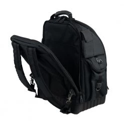 - Main tool compartment: 19 pockets holds drill/drill bit organizer: Front tool compartment: Seven pockets hold up to 8-in. screwdrivers: Rear tech compartment: Three pockets hold 17-in. laptop, tablet or files, total number of pockets: 34