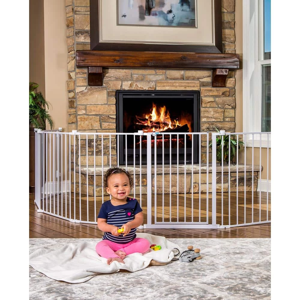 Once your little one starts walking, child proofing your home is a must. Providing a versatile way to keep your child safe, the Regalo Super Wide Baby Gate and Play Yard offers numerous convenient configurations for around the house. This play yard and safety gate features durable all-steel components and a hardware-mount system ideal for large, angled or uneven openings. The super wide gate can be expanded to fit openings up to 192 and comes with eight, 24 panels. The panels connect to hinged posts that offer an amazing variety of shaping possibilities. Easily mounting to the wall, the convenient gate features a walk-through door designed with a double lock lever handle allowing adults to easily pass through. It is ideal as a play yard, fireplace barrier, at the landing of stairs or a super gate for very wide openings.