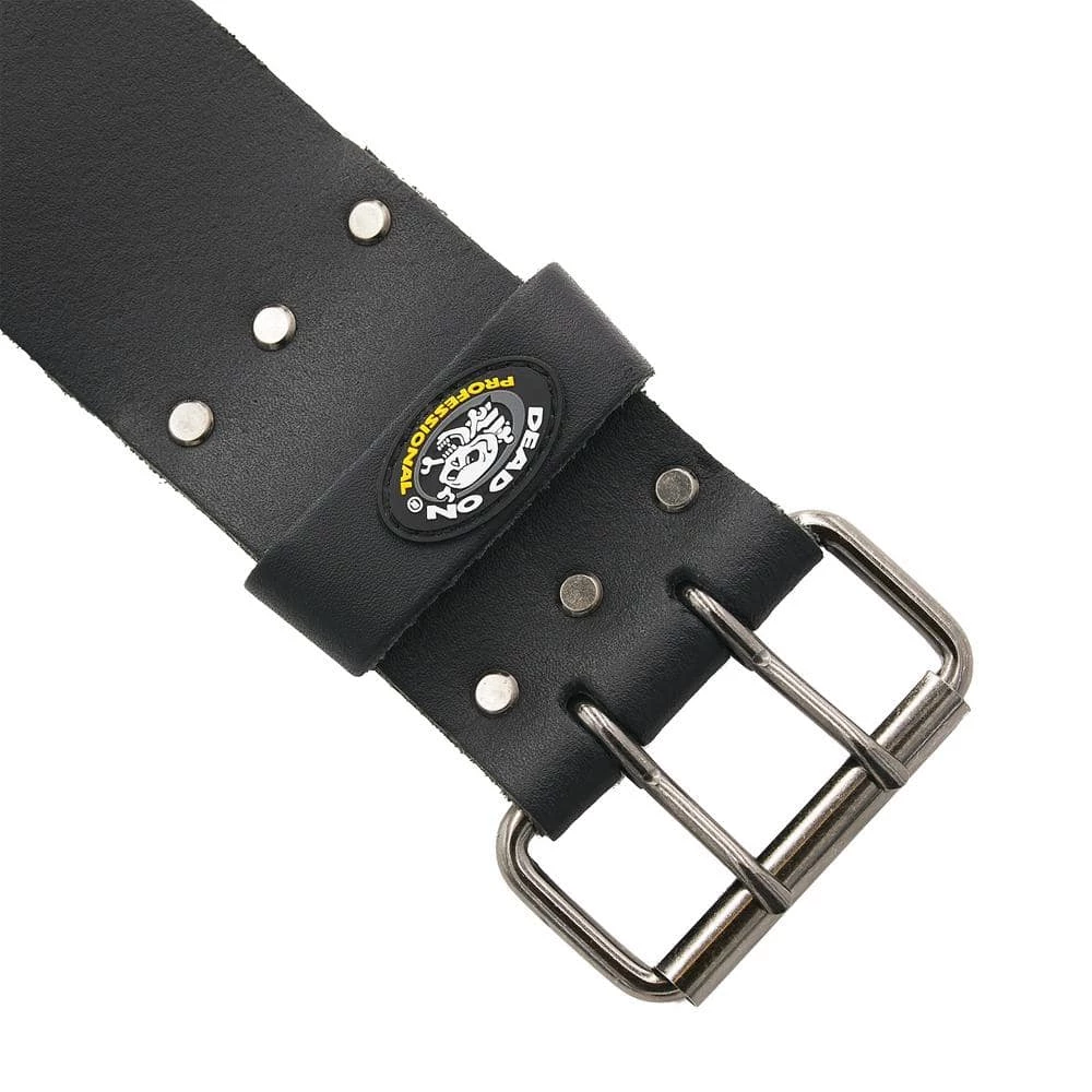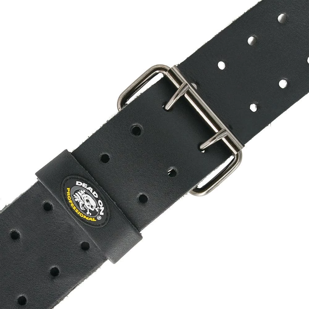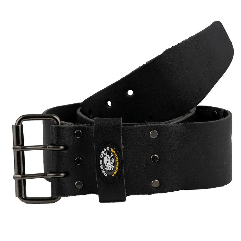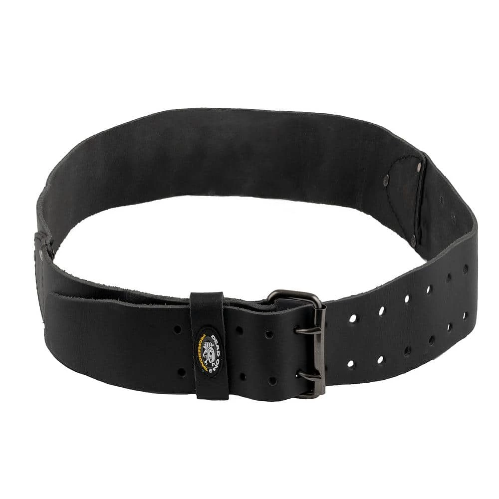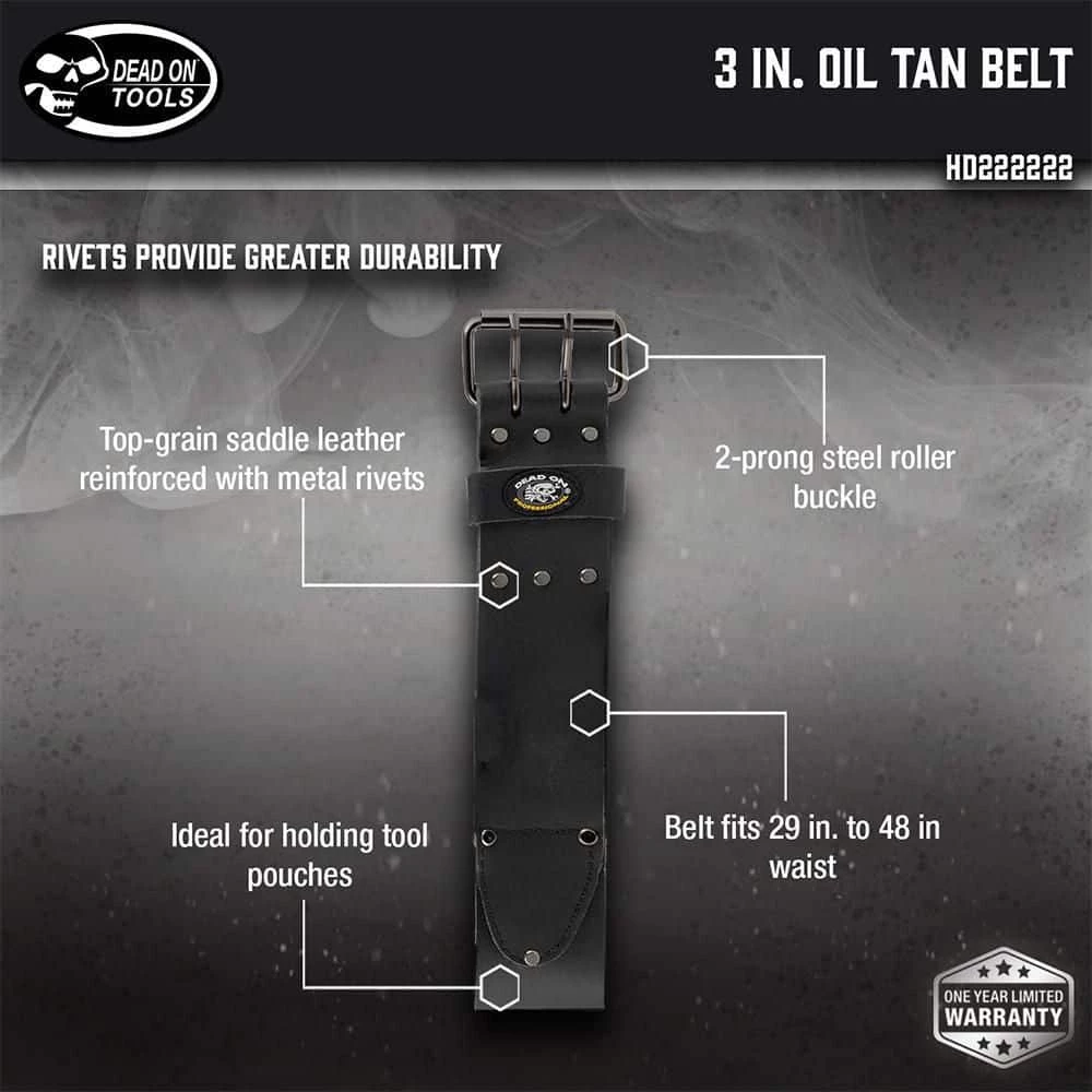 Dead On has risen again! We, the Dead On Tools team, have upgraded our tool rigs and pouches. The iconic DO21C framing hammer is as good as ever. The Annihilator wrecking bar – well, just look at it and you know it means business. The Exhumer nail puller, still the champ. Dead On tool-users don’t check their personality when they punch the clock. Our products match that lifestyle, and stand out in a category of commodity products. The Dead On brand and skull logo are about to become icons for those end users. The Dead on Professional Oil Tan Belt is made from a heavy-duty poly web material and is constructed with top-grain leather to provide ample room for tool pouches. The 3 in. wide belt is adjustable for waists 32 ½ inches up to to 47 inches. The HD222222 features a double-tongue roller buckle for a more secure fit. Rivets are used in key stress points to provide more durability. The Dead on Tools 3 in. Wide Oil Tan Tool Belt in Black Saddle Leather with Double Tongue Roller Buckle is a true performance product designed with the skilled craftsman in mind.