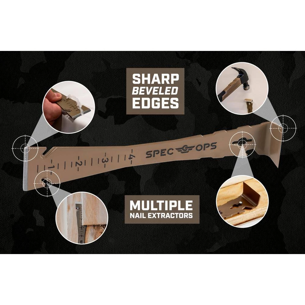 The SPEC OPS Tools 9.5 in. Trim Bar is the perfect addition to any professional’s pry bar selection. This pry bar is constructed from rugged and durable high-carbon spring steel to mitigate any bending or snapping while in use, ensuring that this elite bar is made to last. Unlike other pry bars or scraper bars in the market, we’ve added a small, 4 in. ruler for fast and accurate measurements when working on a job site. Exceeding expectations on any mission, the sharp beveled edges are critical for applications such as trim/molding removal, scraping, demo work, and prying. The 90° strike surface end with sharp edge is best used for siding nail removal or prying between finish work. For additional functionality, this trim bar comes with a nail puller, nail pulling slots for shingles, and an onboard bottle opener. This bar has been drop tested at 100 ft. to surpass MIL-SPEC standards. All SPEC OPS tools are backed by our 5-star, hassle-free lifetime warranty, and with each purchase made, we support our nation’s heroes by donating 3% of proceeds to veteran and first responder causes.