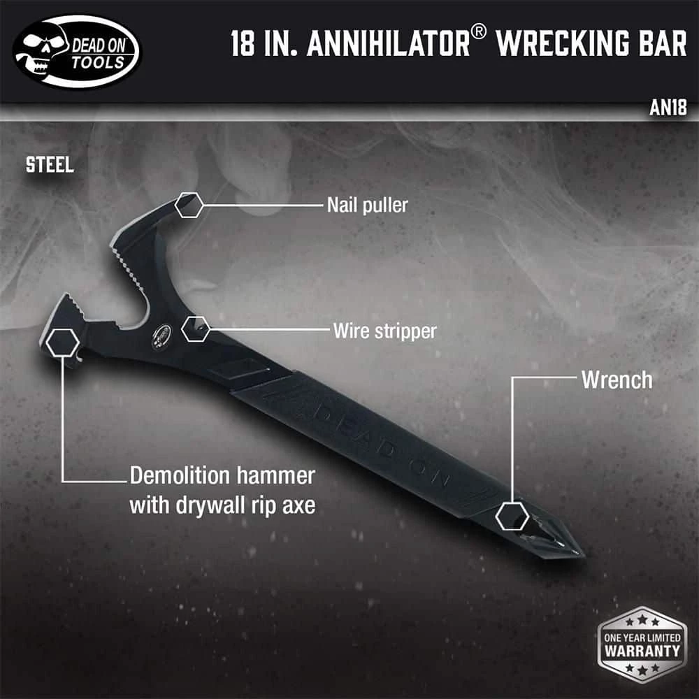 We created the baddest, meanest utility bar ever. The Annihilator will make short work of the most difficult jobs and includes the Demolition Hammer used for breaking down hard surfaces, as well as other general hammer uses. The Dead On Tools Annihilator 18 in. Wrecking/Utility Bar in black is the perfect tool for demolition and putting things back together. Chisel, smash, crack and chip away at tile, concrete, brick and other hard materials. And when your day is complete, you can use the bottle opener under the hammer head to pop open your favorite beverage. The Dead on Tools AN18 demolition hammer features a board claw for adjusting wood and drywall positioning, a wire stripper, drywall rip axe, 2 nail slots, and nail puller. At an overall length of 18 inches with a 12-inch bar length, this Annihilator Utility and Wrecking Bar is great for straightening and adjusting boards into proper positions before tacking. Great for use on standard board sizes. The demolition axe can be used to tear and rip through drywall, wooded slots, remove shingles, and can wire strip through a conduit. The Annihilator is our answer to the toughest jobs out there