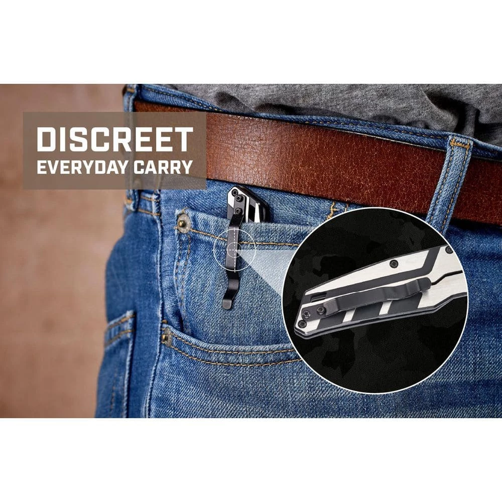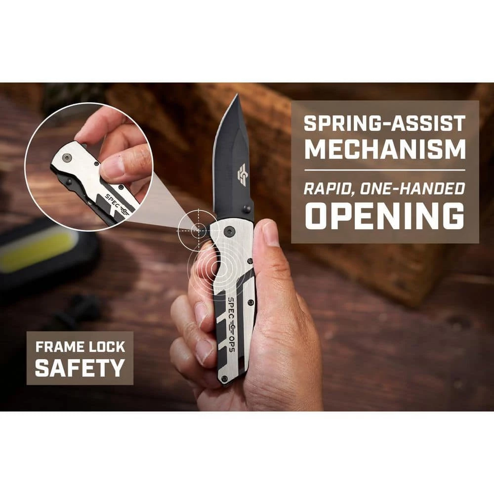 Designed to be durable and practical, the SPEC OPS Tools Folding Pocket Knife is constructed with tough and wear resistant D2 high carbon steel, making this EDC a dependable knife that maintains a sharp edge while also resisting corrosion. With a classic drop point style blade that provides unmatched control, this pocket knife is sure to be your new go-to. This folding knife also offers a spring-assisted mechanism that allows for quick and easy 1-handed opening, while the liner lock safety ensures safe operation every time. The featured sturdy belt clip will secure your knife tightly to your pocket for discreet carrying. A lanyard hole on the back is constructed for retention systems or tie-downs. And with a guarantee to deliver a lifetime of mission capability on the world’s toughest job sites, this pocket knife has been drop tested to exceed MIL-SPEC standards. All SPEC OPS tools are backed by our 5-star, hassle-free lifetime warranty, and with each purchase made, we support our nation’s heroes by donating 3% of proceeds to veteran and first responder causes.