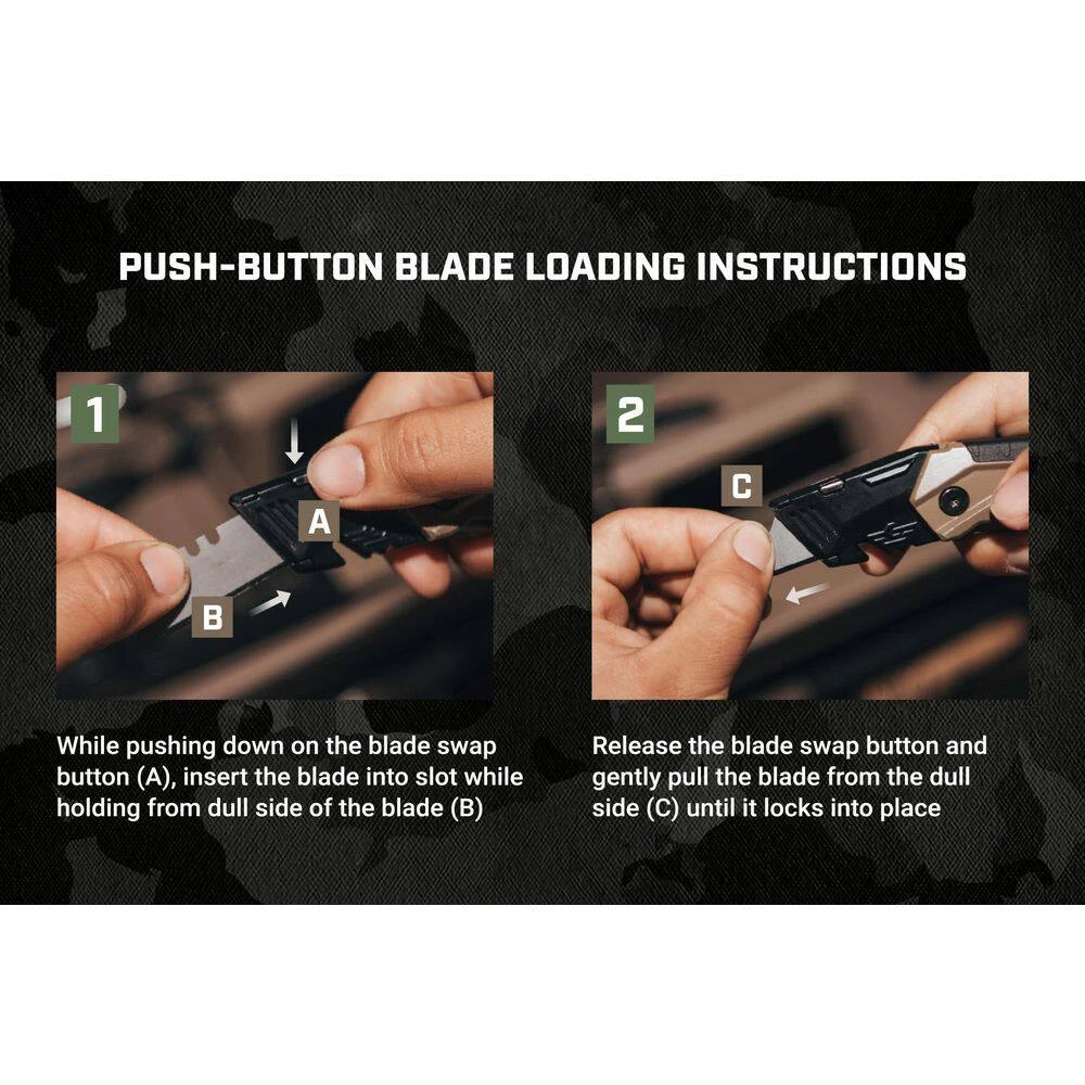 Built with an armor-grade aluminum body, this SPEC OPS fixed folding utility knife is dutifully compact yet tested and proven unbreakable on the harshest jobsites. At just 3.5 in. when folded, this knife seamlessly fits in your pocket and comes with a belt clip for optimum portability and storage. Its unique pistol style finger grip and camo textured body allows for elite comfort and ultimate control when cutting. The push-button blade swap allows for tool-free and rapid re-loading of utility blades. Integrated into the knife’s design is a quick-release button on the rear of the knife that reveals a blade magazine with three (3) standard utility blades included.