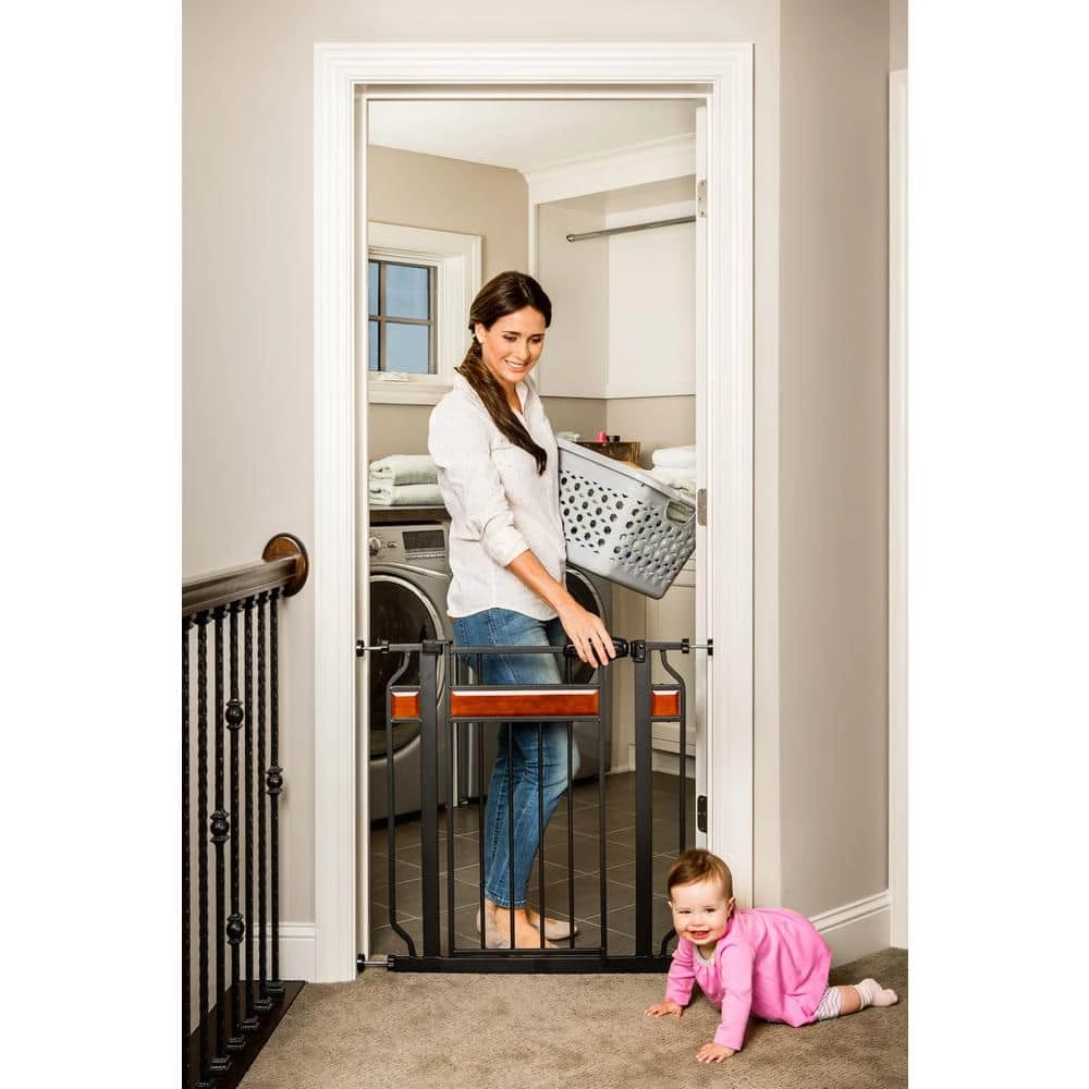 Your baby is now mobile, it’s time to childproof your house. The Regalo Home Accents Designer Baby Gate has enhanced styling’s while keeping the functionality you need from a baby gate. Boasting a black steel frame, with cherry wood accents the designer baby gate was made for not only durability and strength, but to fit with the decor of most homes. This attractive safety gate is adjustable to accommodate door openings between 30 in. to 42 in. To make gate installation a breeze, pressure mount the gate with the included rubberized tension hand wheels or use the included hardware to attach the gate to your wall.