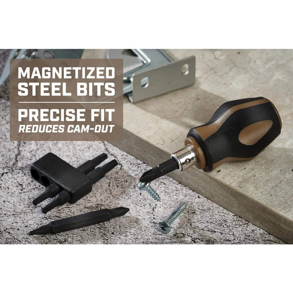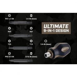 With just a 2 in. handle, this SPEC OPS Multi-Bit 9-in-1 Stubby Screwdriver is perfect for getting into tight spaces where a standard screwdriver won’t fit. Offering more torque and longer tip life for ultimate control and perfect tip fit, this stubby screwdriver includes 9 different applications: one ¼ in. nut driver and four double-sides bits: PH#1 x Slotted 3/16 in., PH#2 x Slotted ¼ in., T15 x T25, SQ#1 x SQ#2. All SPEC OPS screwdrivers are manufactured with CR-MO heat-treated double-sided bits for up to 2x longer tip life. Ideal for tight areas and on-the-go usage, the magnetized, Black-Ops Coated Tips provide a precise fit that reduces cam-out. These screwdrivers are tough, durable, and constructed with max-control MOA grips for up to 40% more torque. And with a guarantee to deliver a lifetime of mission capability on the world’s toughest job sites, these screwdrivers have been drop tested at 100 ft. to surpass MIL-SPEC standards. All SPEC OPS tools are backed by our 5-star, hassle-free lifetime warranty, and with each purchase made, we support our nation’s heroes by donating 3% of proceeds to veteran and first responder causes. TORX is a registered trademark of Acument Intellectual Properties, LLC.