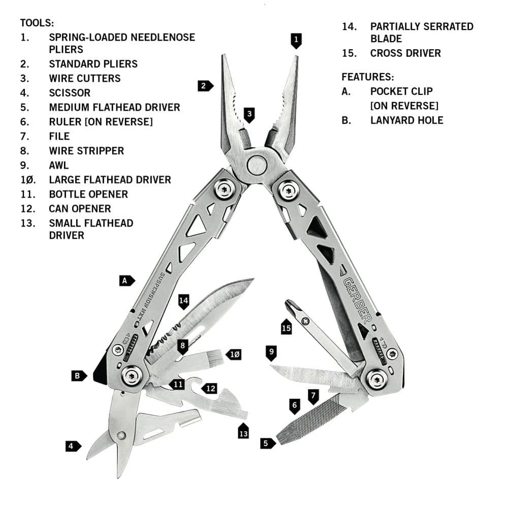 - 15-tools include: needle nose pliers, regular pliers, wire cutters, 2.25 in. fine and serrated edge combo knife blade, scissors, cross head screw driver, large, medium, small flathead screw drivers, can opener, bottle opener, awl, file, ruler, wire stripper