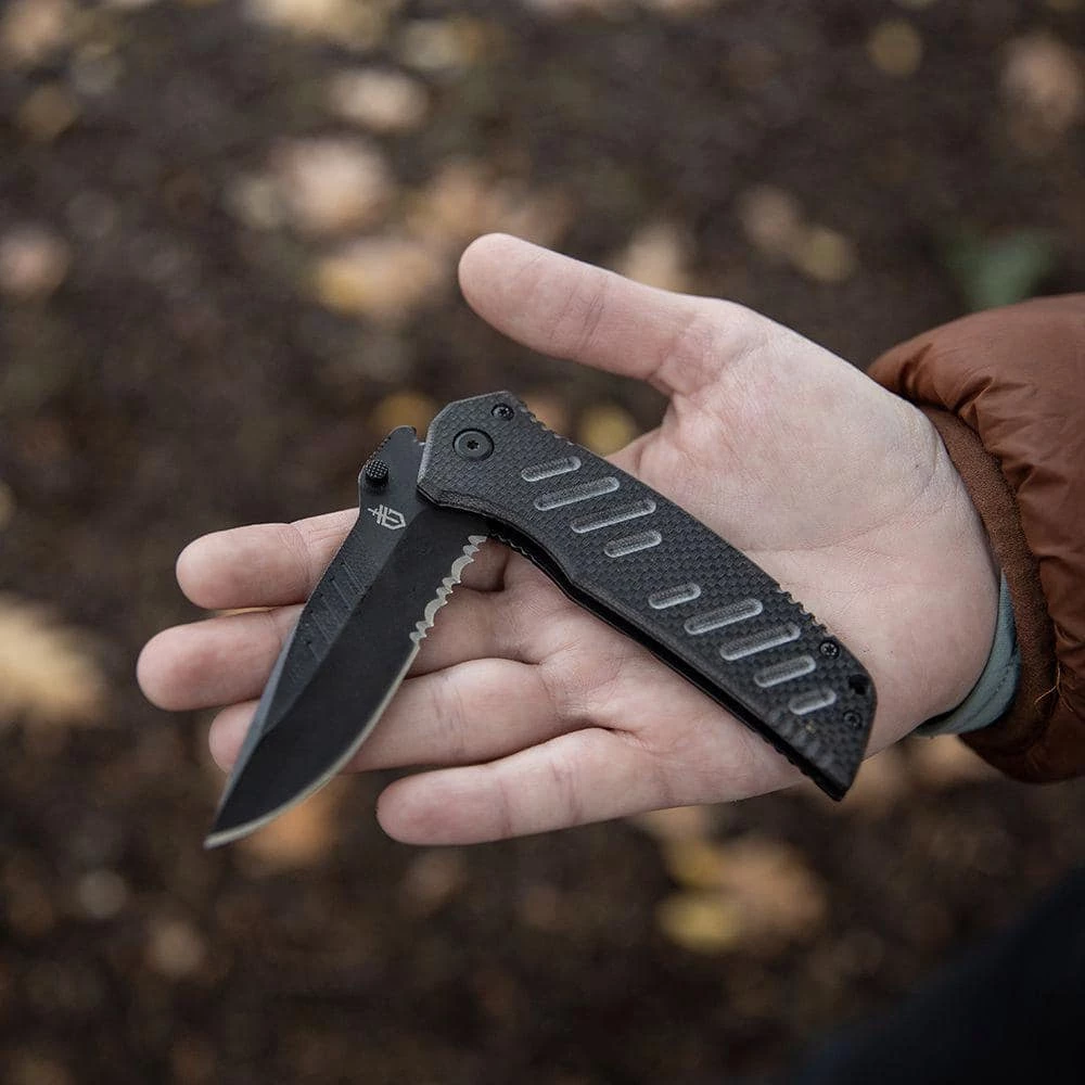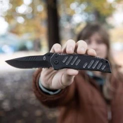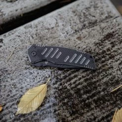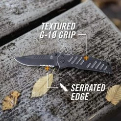 This tactical folder is engineered to be stealthily effective, with a machine styled black blade and a matching G-10 handle. The drop point blade is partially serrated. Sturdy frame lock adds confident application.