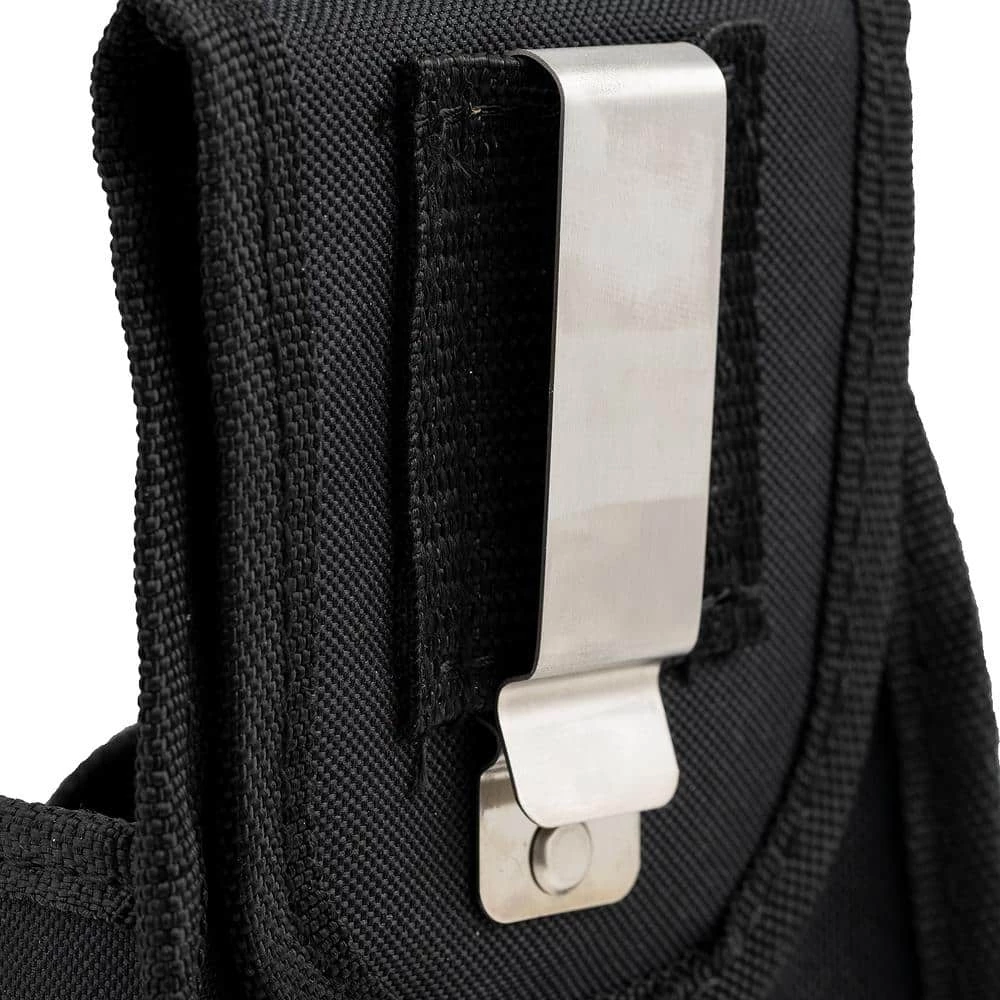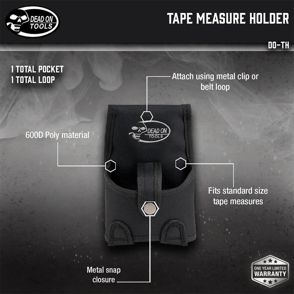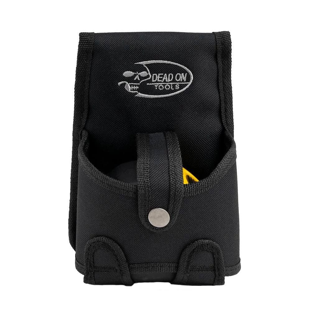 The Dead On Killer Precision Tape Holder is constructed with 600 denier poly ripstop ballistic nylon rugged material for long life and durability and is made with a classic skull embroidered logo. It can be clipped onto pants or looped onto a belt. The locking strap keeps the tape measure from falling out. The Tape Measure Holder provides dedicated space for keeping tape measures at the ready. Designed to carry most standard-size tape measures. Can be clipped or attached on a belt loop and features a retaining strap to keep contents in place. The DO-TH Tape Measure Holder Accessory complements the Dead-On Ballistic Framer’s Rigs Series (DO-FRXL, DO-FRL, DO-FRM). This tape measure holder is built with a molded shape for fast in & fast out for your tape measure. You can hold most standard and some large size tape measures in this great pouch. The DO-TH has a dual fastening system that can be used as a clip on or use on your belt loops. Lastly, this tape measure pouch holder has a locking strap with a snap to keep your tape measurer secure.